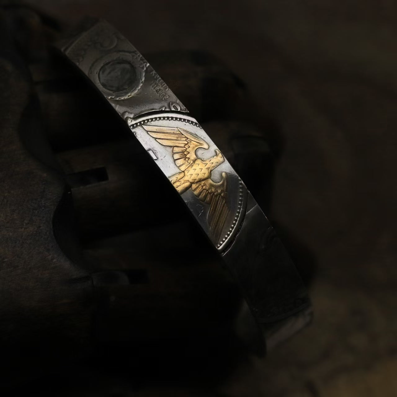 The Mark Bangle/Ring is made from 90% silver Mark coins, with each coin meticulously selected for its optimal patterns, expertly shaped, polished and welded.
