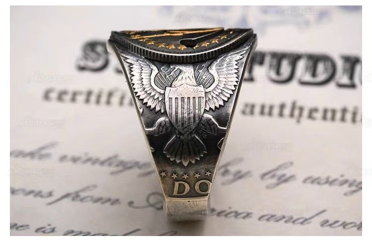 The ring is crafted from two distinct coins. The main body is made from 90% silver 1964 JFK half dollars, and the front features a 90% silver 1940 Helvetia Goddess Silver Coin.